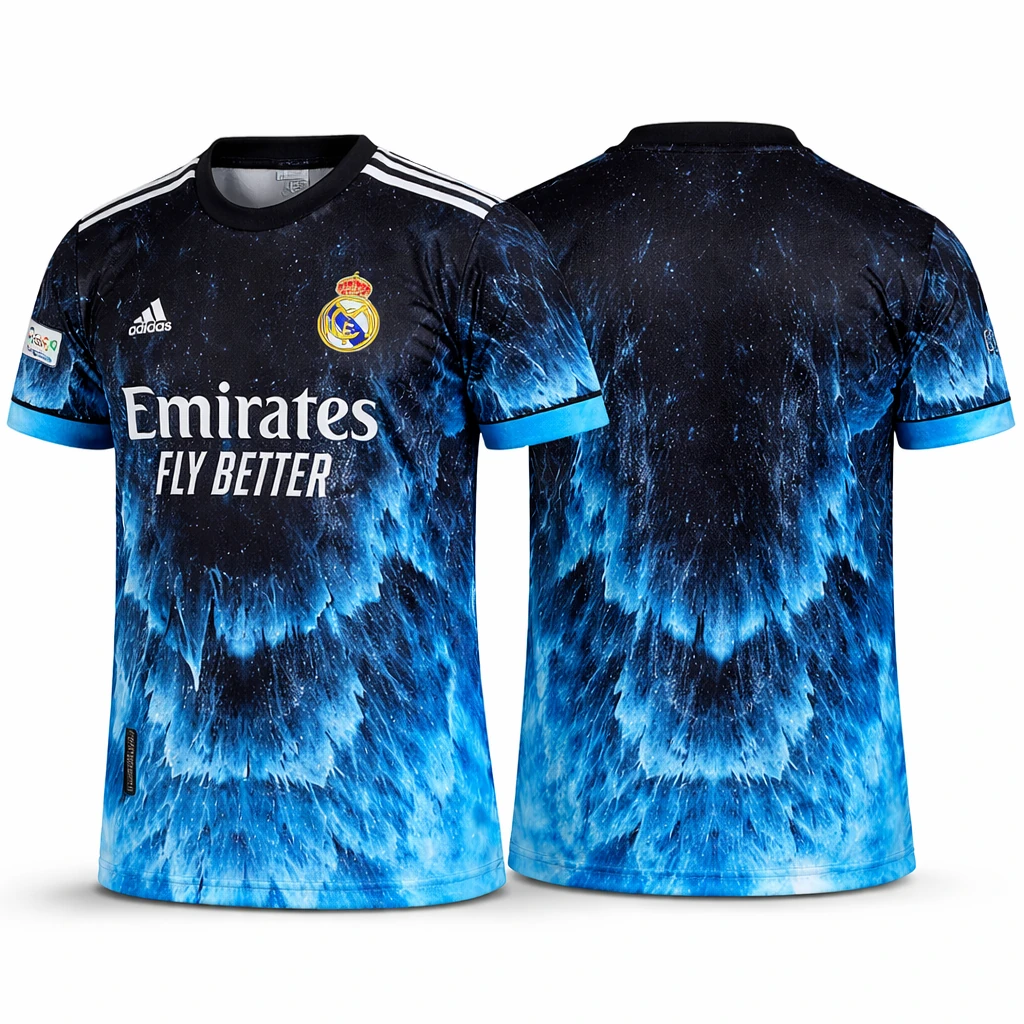 Unlike the traditional all-white Madrid kits, the Ocean Blue Edition represents a shift toward style evolution — perfect for fans who want to make a statement while staying true to the club’s identity. The shirt showcases a clean deep blue base, accented with sharp white trims and a bold crest, celebrating Real Madrid’s strength and elegance in a new tone.